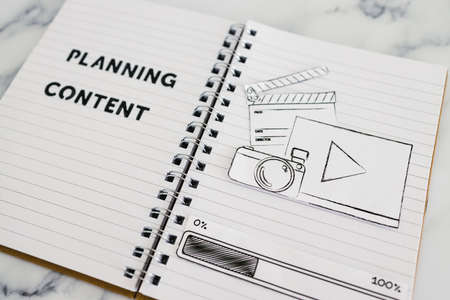 planning content for social media conceptual image, notebook with photo and video icon next to text and progress bar loading