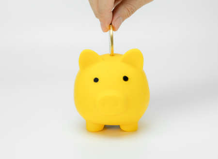 hand inserting a money coin into the piggy for saving money wealth in concept of economy and crisis
