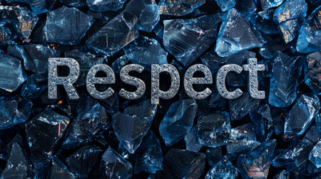 closeup of a young caucasian man showing a pinkish violet building block with the text respect written in it, on a dark gray surface