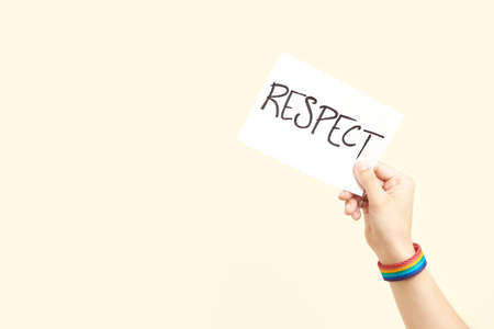 Young hand with a rainbow bracelet, LGBT symbol, holding a piece of paper with a handwritten message: respect. Concepts of love, sexual diversity and non-discrimination. Image with copy space.