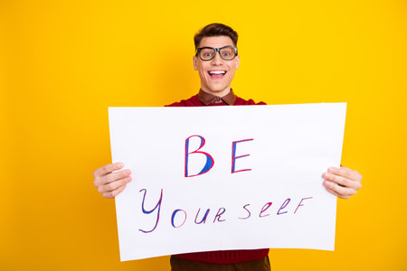 Handsome Young Man Holding Sign Saying Be Yourself Against Vibrant Yellow Background