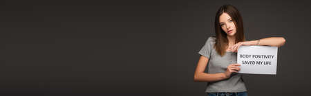 pretty brunette woman holding card with body positivity saved my life lettering isolated on grey, banner