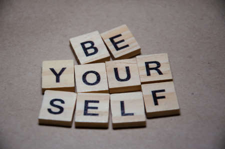 Selective focus on Inscription Be Yourself outlined on beige background with copy space. Motivational card with phrase be yourself. Concept of self-identification.
