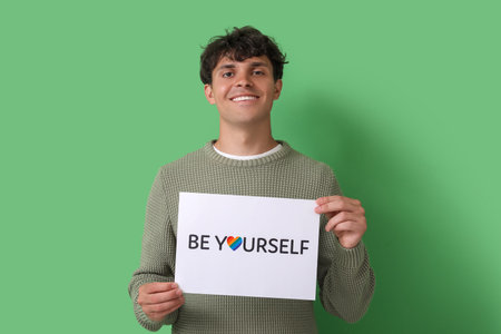 closeup of a young caucasian man in the street showing a notepad with the text be yourself written in it