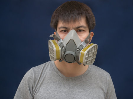 Portrait of a man in an industrial respirator on a gray background. An adult male with short hair wearing a blue and yellow respirator. Half mask with replaceable filters. Indoors. Safety first