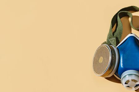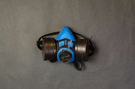Close up of Protective gas mask with a filter on a gray dirty background, doomsday, virus