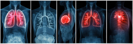 Doctor examines chest X-ray while reviewing lung health model in clinic setting
