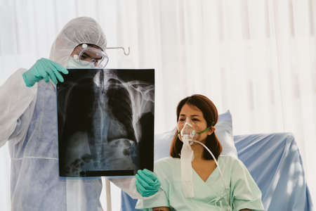 Caring for patients with the flu Covid-19 : The radiologist looked at the chest X-ray film of a woman with respiratory pulmonary disease and explained to the patient at the hospital.