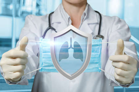 the doctor holds the lungs organ symbol. Awareness of lung cancer, pneumonia, asthma, COPD, pulmonary hypertension, world no tobacco day and eco air pollution. Respiratory and chest concept.