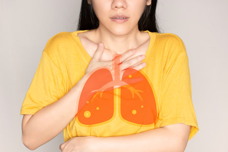 Man holding hands near chest with illustration of lungs on gray background, closeup