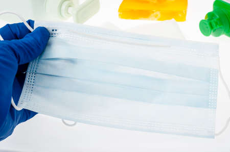 Close up, hygienic measures, surgical and hydroalcoholic masks, on a light background