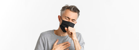 Concept of covid-19, social distancing and quarantine. Close-up of sick middle-aged man in black medical mask, coughing and feeling bad, standing over white background