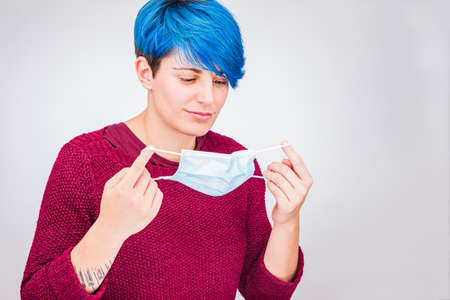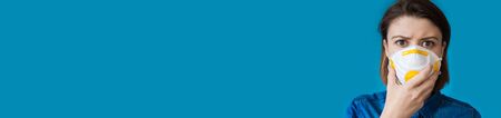 Worried caucasian lady holding a mask with filter while posing on a blue wall with free space