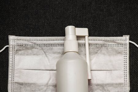 White antiseptic bottle and a mask of one protective medicine on a gray table, on a background of a white brick wall. Prevention of coronavirus disease Covid-19 during an outbreak of influenza virus.