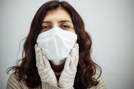 Portrait of a young woman holds hands on her head and has to stay home during quarantine due to coronavirus pandemia. Beautiful girl wearing medical mask and gloves. Covid-19 epidemia concept