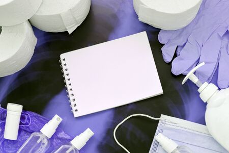 Set of items for Covid-19 quarantine. Empty notepad page and toilet paper, rubber disposable gloves with surgical face mask and hand sanitizer with liquid soap bottle on human chest x-ray film