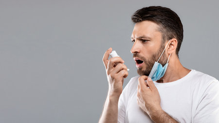 Portrait of man with protective mask using inhaler