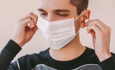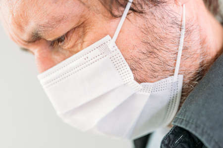 Caucasian man wearing protective respiratory face mask to protect himself from Covid-19 infection, selective focus