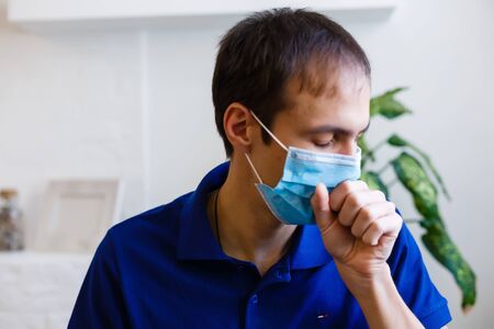 young man in surgical mask coughing and sneezes close up
