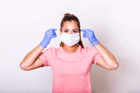 how to put a COVID-19 mask. Woman with Coronavirus breath mask