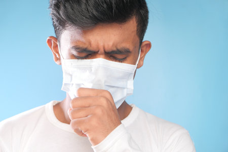 men with a face mask coughs