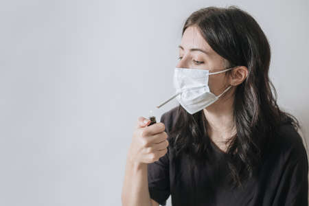 Senior woman hold a cigarette in mouth,withdrawal symptoms,cigarette cravings,feeling stressful while wear a face mask during the pandemic virus,elderly female is addicted