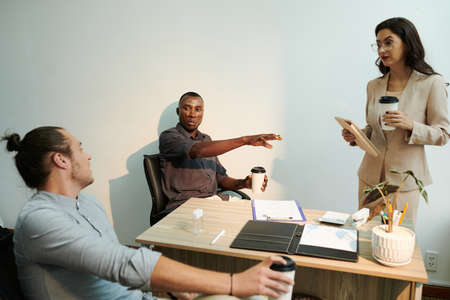 Colleagues working together in modern office using devices and gadgets during creative meeting