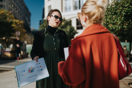 Two women in business conversation on a sunny city street with a clipboard and charts