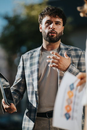 Professional man in plaid blazer speaks with tablet during outdoor business discussion