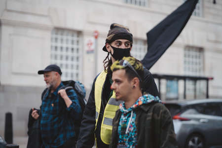 Westminster, London | UK - 2021.05.01: People wearing masks and waving flags and banners at Kill the Bill protest.