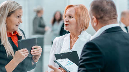 Businessman discussing research report and project feedback with bank consultant and smartphone chat