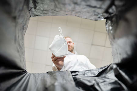 Throwing a face mask into the trash. With a worm view from the inside of the trash bin.