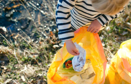 Unrecognizable small child collecting rubbish outdoors in nature, plogging concept.
