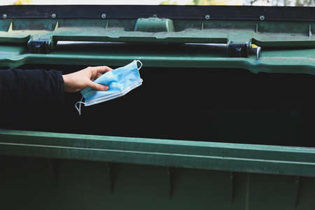 Throwing away a medical mask in a green container for recycling on a blue background. Blue face masks after use. The use of medical masks