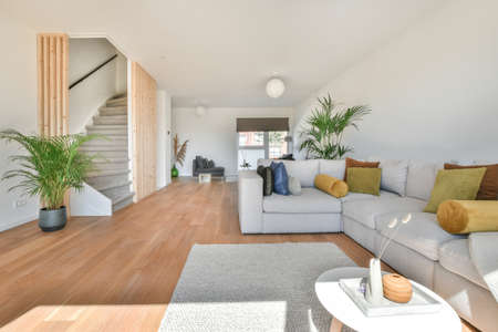 Luxury living room interior with white sofa and wooden coffee table. Nobody inside