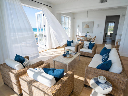Luxury living room with wicker furniture and patio area. Nobody inside