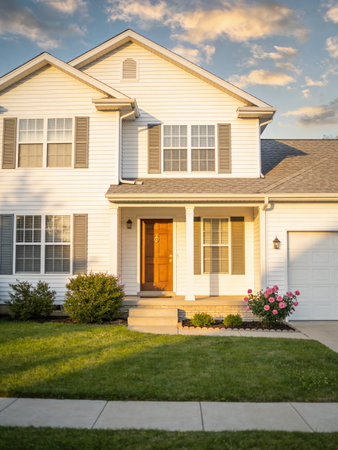 Neighborhood architecture. Property in neighborhood. Residential property house. Residence architecture. Suburban neighborhood. Suburban house architecture. Private family house. Housing market