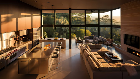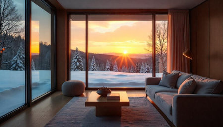 Luxury living room interior with large windows overlooking the city. Nobody inside