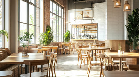 A bright and airy cafe space with wooden tables, neutral-hued chairs, and stylish industrial pendant lights, radiating warmth.
