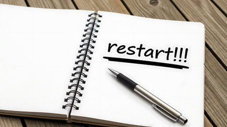 Restart! Starting again after a break, after a pandemic. Word Restart written in black ink on the blank page of a notebook, placed on a wooden surface.