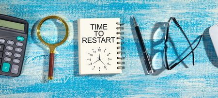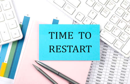 TIME TO RESTART text on blue sticker on chart with calculator and keyboard,