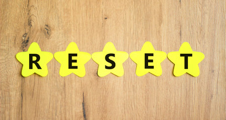 Reset symbol. Concept word Reset on beautiful yellow paper stars. Beautiful wooden table wooden background. Business lifestyle reset concept. Copy space.