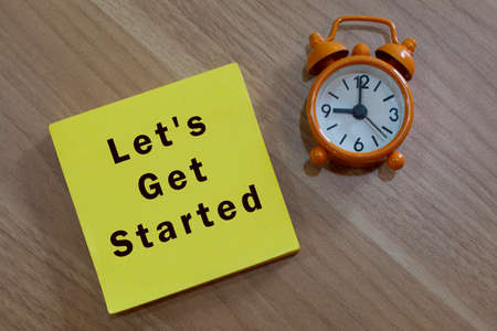 Lets get started - message with advice on yellow notepad with alarm clock on wooden desk
