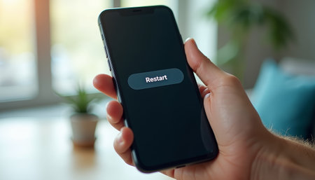 Hand holding smartphone with Restart button, digital refresh. generated by ai