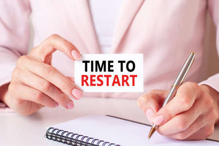 Woman writes in a notebook with a silver pen and hand holding card with text: TIME TO RESTART. Pink background, front view. Business and education concept.