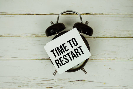 Time to Restart text message on paper with alarm clock on wooden background