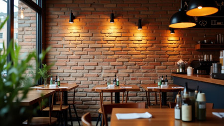 Warm rustic brick wall serving as backdrop to cafe's comforting vibe, Professional stock photo, AI generated photograph