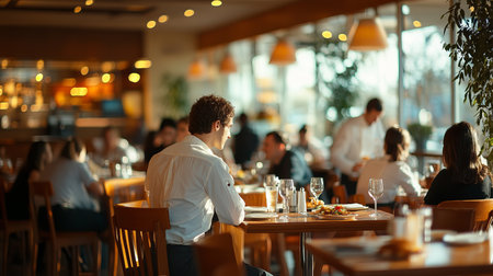 Blurred restaurant background with some people eating and chefs and waiters working. Generative AI