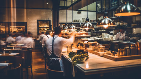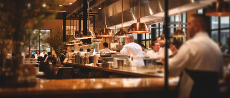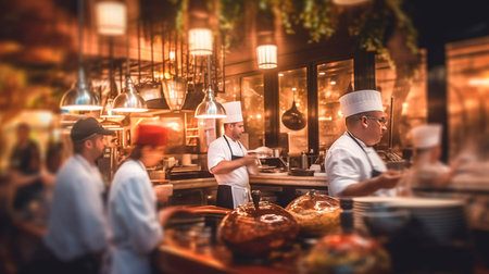 blurred background of a restaurant featuring chefs, waiters and patrons, showcasing the hustle and bustle of a lively diner