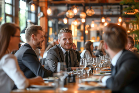 A group of young professionals sitting at a wooden table in a restaurant, eating lunch and engaging in conversation. The scene conveys a social dining experience, business lunch, or gathering of friends enjoying a meal together.